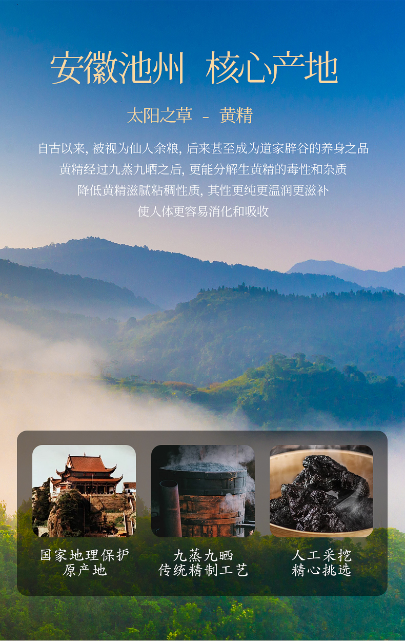 1、严选九华山核心产区黄精,聚焦北纬 30° 黄金地带的自然馈赠,只取 8 年生臻品原料,从源头确保食材的地道品质与醇厚营养,尽显珍稀属性。