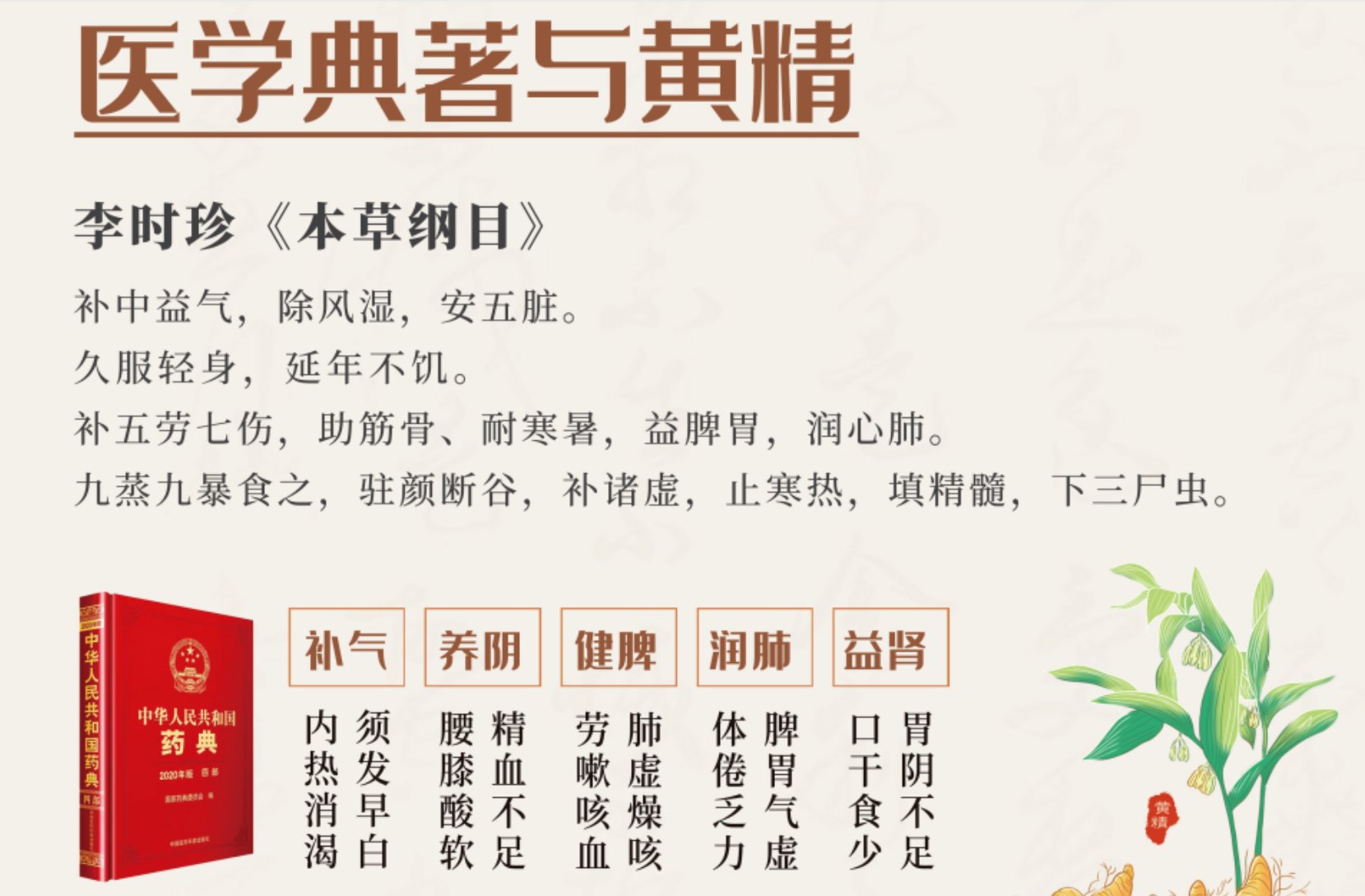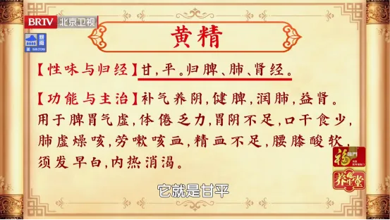 2020版《中国药典》记载:黄精性甘、平。归脾、肺、肾经。具有“补气养阴、健脾、润肺、益肾”的作用。