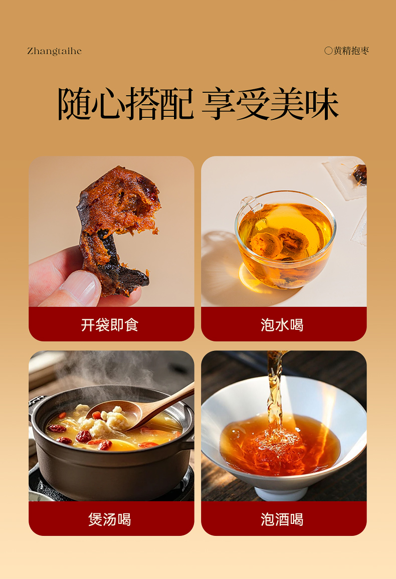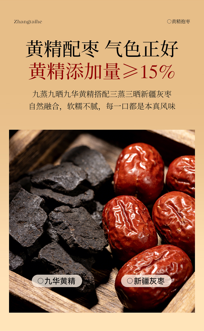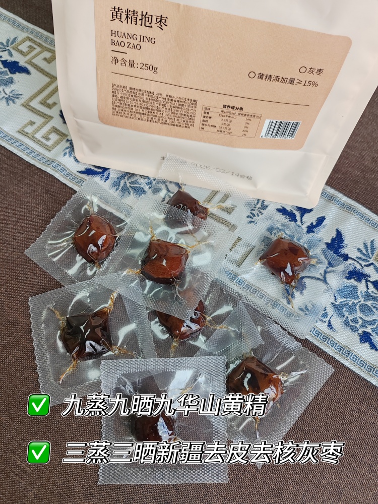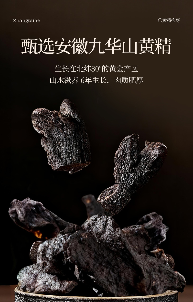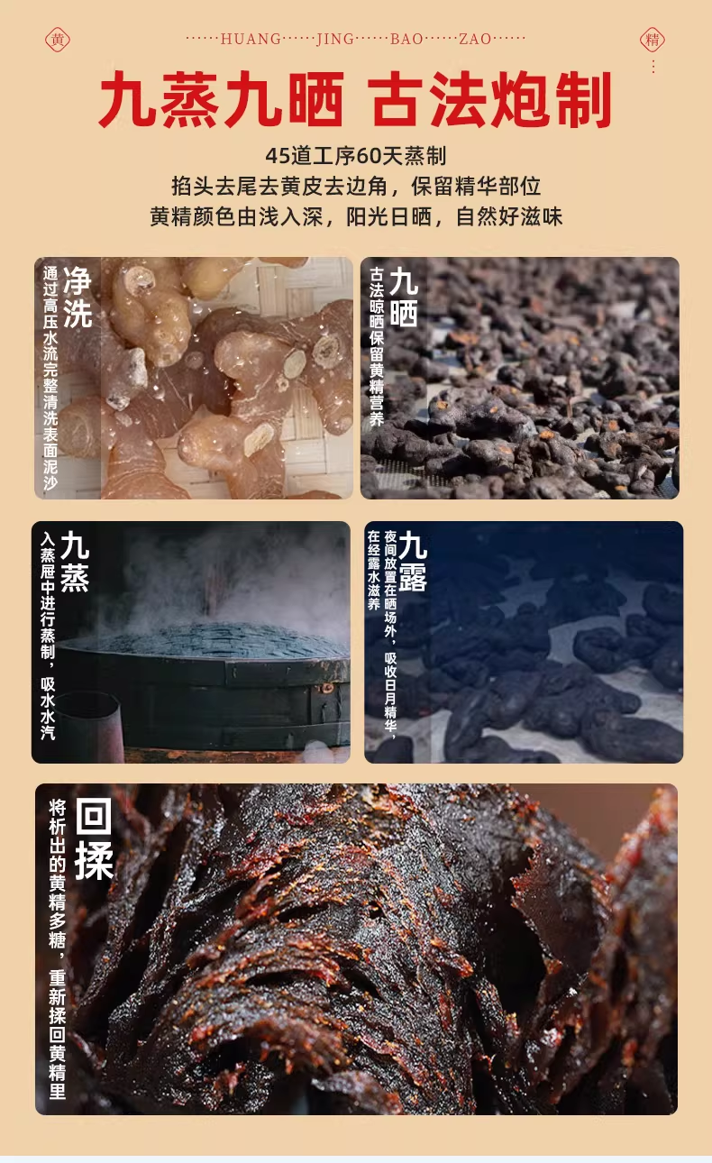 生黄精有麻味,容易刺激咽喉,而这款黄精抱枣里,黄精用千年古法九蒸九晒。